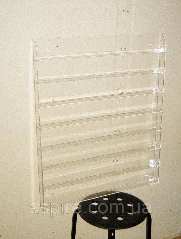 Стенд для лаків настінний 8 ярусний. Габаритні розміри 620х45х748 мм. Відстань між ярусами 92 мм. Матеріал — оргскло (акрил) 3 мм прозоре. На задній стінці передбачені грушоподібні отвори для кріплення.